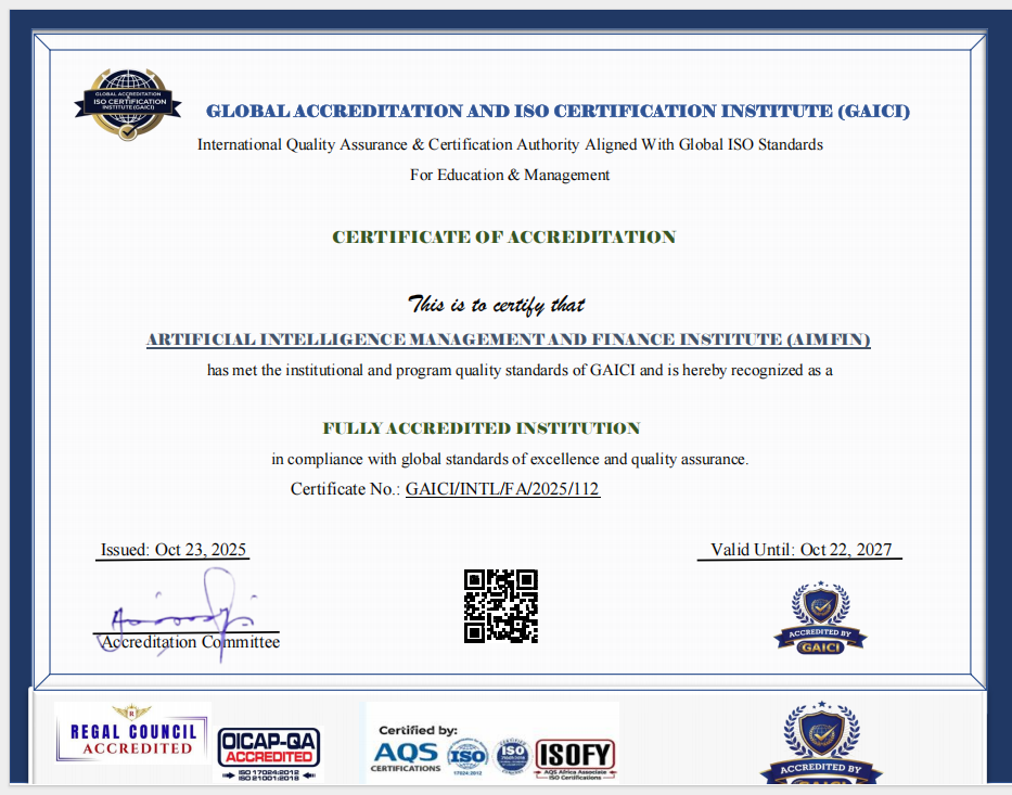 This is to certify that the Artificial Intelligence Management and Finance Institute (AIMFIN) has successfully met the international standards of quality and excellence in institutional management, professional training, and academic program delivery.